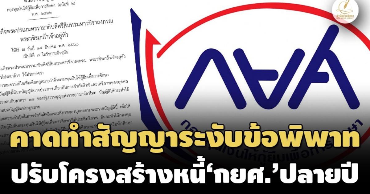 สำนักข่าวอิศรา (www.isranews.org) รายงานว่า เมื่อวันที่ 19 ก.ย. กองทุนเงินให้กู้ยืมเพื่อการศึกษา (กยศ.) เผยแพร่เอกสารข่าวอ้างคำพูด นายชัยณรงค์ กัจฉปานันท์ ผู้จัดการ กยศ. ว่า การปรับโครงสร้างหนี้ตาม พ.ร.บ.กยศ.ฉบับใหม่ กองทุนฯคาดว่าจะเปิดทำสัญญาระงับข้อพิพาทก่อนฟ้อง และสัญญาปรับโครงสร้างหนี้สำหรับลูกหนี้ก่อนฟ้องและหลังฟ้องทุกกลุ่มเข้ามาดำเนินการได้ในช่วงปลายปีนี้ และจะปลดภาระผู้ค้ำประกัน เมื่อผู้กู้ยืมเงินได้ทำสัญญาปรับโครงสร้างหนี้แล้วเสร็จ