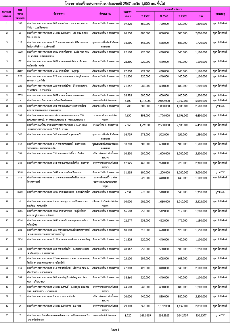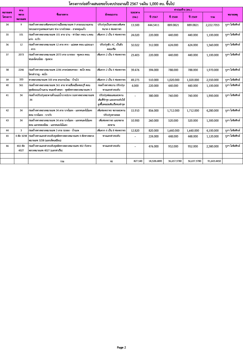 1.กรมทางหลวง (ทล.) 46 โครงการ ระยะเวลาดำเนินการตั้งแต่ปี 2567 - 2569 วงเงินรวมทั้งสิ้น 91,643.4450 ล้านบาท โดยเป็นการดำเนินการตามแผนงานบูรณาการพัฒนาด้านคมนาคมและระบบโลจิสติกส์ จำนวน 42 โครงการ วงเงินรวม 83,957.7053 ล้านบาท และแผนงานบูรณาการเขตพัฒนาพิเศษภาคตะวันออก จำนวน 4 โครงการ วงเงินรวม 7,685.7397 ล้านบาท ซึ่งมีวัตถุประสงค์เพื่อพัฒนาโครงข่ายทางหลวงแผ่นดินให้สมบูรณ์และมีประสิทธิภาพ สามารถใช้งานได้อย่างปลอดภัย และสามารถรองรับปริมาณการจราจรในปัจจุบันและอนาคตที่มีแนวโน้มเพิ่มสูงขึ้น รวมถึงช่วยลดต้นทุนด้านโลจิสติกส์ของประเทศ ทั้งนี้ ทล. มีวงเงินที่ขอตั้งงบประมาณปี 2567 จำนวน 18,328.6890 ล้านบาท ทั้ง 46 โครงการ ประกอบด้วย (ดูภาพด้านล่าง)