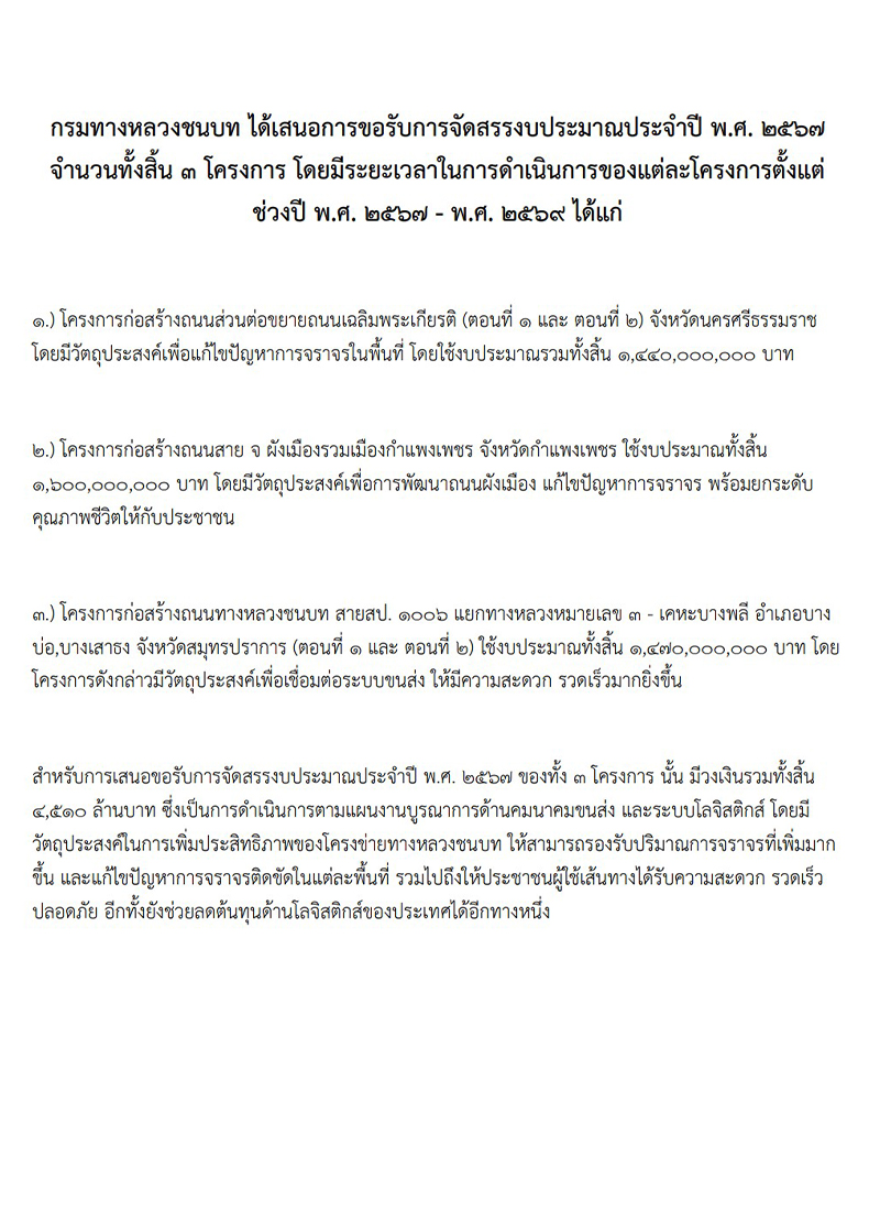 2.กรมทางหลวงชนบท (ทช.) ได้เสนอขอตั้งงบประมาณปี 2567 จำนวน 3 โครงการ ระยะเวลาดำเนินการปี 2567 - 2569 วงเงินรวมทั้งสิ้น 4,510 ล้านบาท โดยเป็นการดำเนินการตามแผนงานบูรณาการพัฒนาด้านคมนาคมและระบบโลจิสติกส์ โดยมีวัตถุประสงค์เพื่อเพิ่มประสิทธิภาพของโครงข่ายให้สามารถรองรับปริมาณจราจรที่เพิ่มขึ้น และแก้ไขปัญหาการจราจรติดขัด รวมทั้งผู้ใช้ทางได้รับความสะดวก รวดเร็ว ปลอดภัย และช่วยลดต้นทุนโลจิสติกส์ของประเทศ ทั้งนี้ ทช. มีวงเงินที่ขอตั้งงบประมาณปี 2567 จำนวน 902 ล้านบาท สำหรับ 3 โครงการ ประกอบด้วย