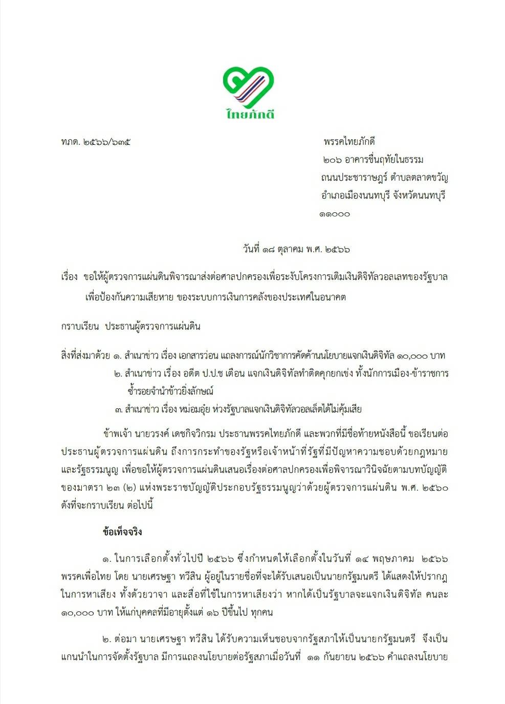 เมื่อวันที่ 18 ต.ค. ที่สำนักงานผู้ตรวจการแผ่นดิน นพ.วรงค์ เดชกิจวิกรม ประธานพรรคไทยภักดี และคณะ เข้ายื่นเรื่องร้องเรียนต่อประธานผู้ตรวจการแผ่นดิน เรื่อง ขอให้ผู้ตรวจการแผ่นดินพิจารณาส่งต่อศาลปกครอง เพื่อระงับโครงการเติมเงินดิจิทัลวอลเลตของรัฐบาล เพื่อป้องกันความเสียหายของระบบการคลังของประเทศในอนาคต โดยมี นายปิยะ ลือเดชกุล ผู้อำนวยการสำนักตรวจสอบเรื่องร้องเรียน เป็นผู้รับเรื่อง