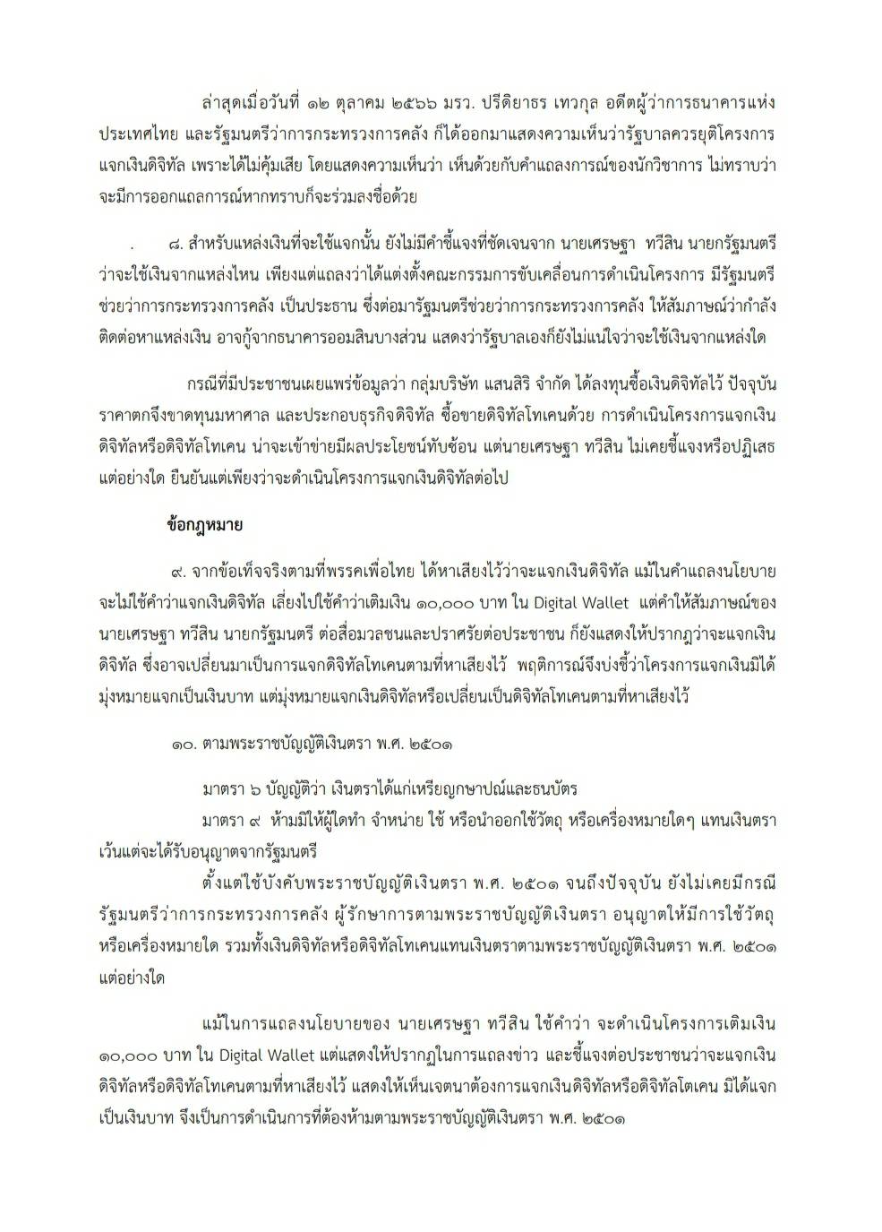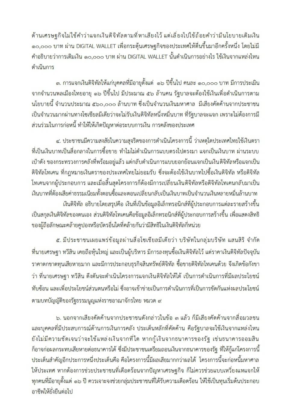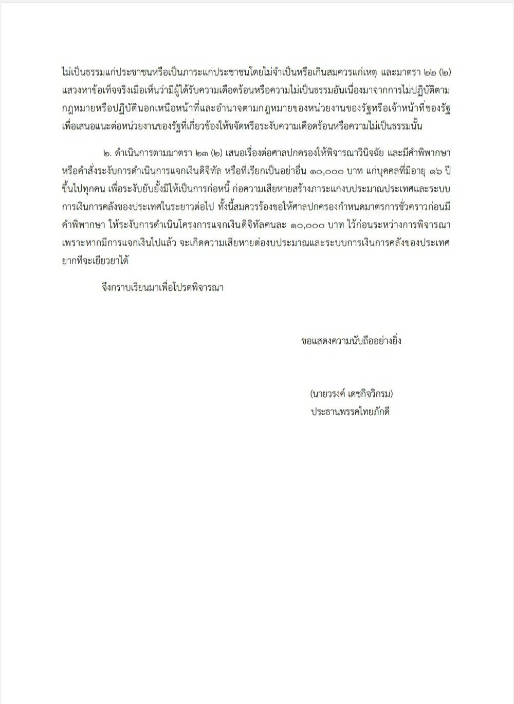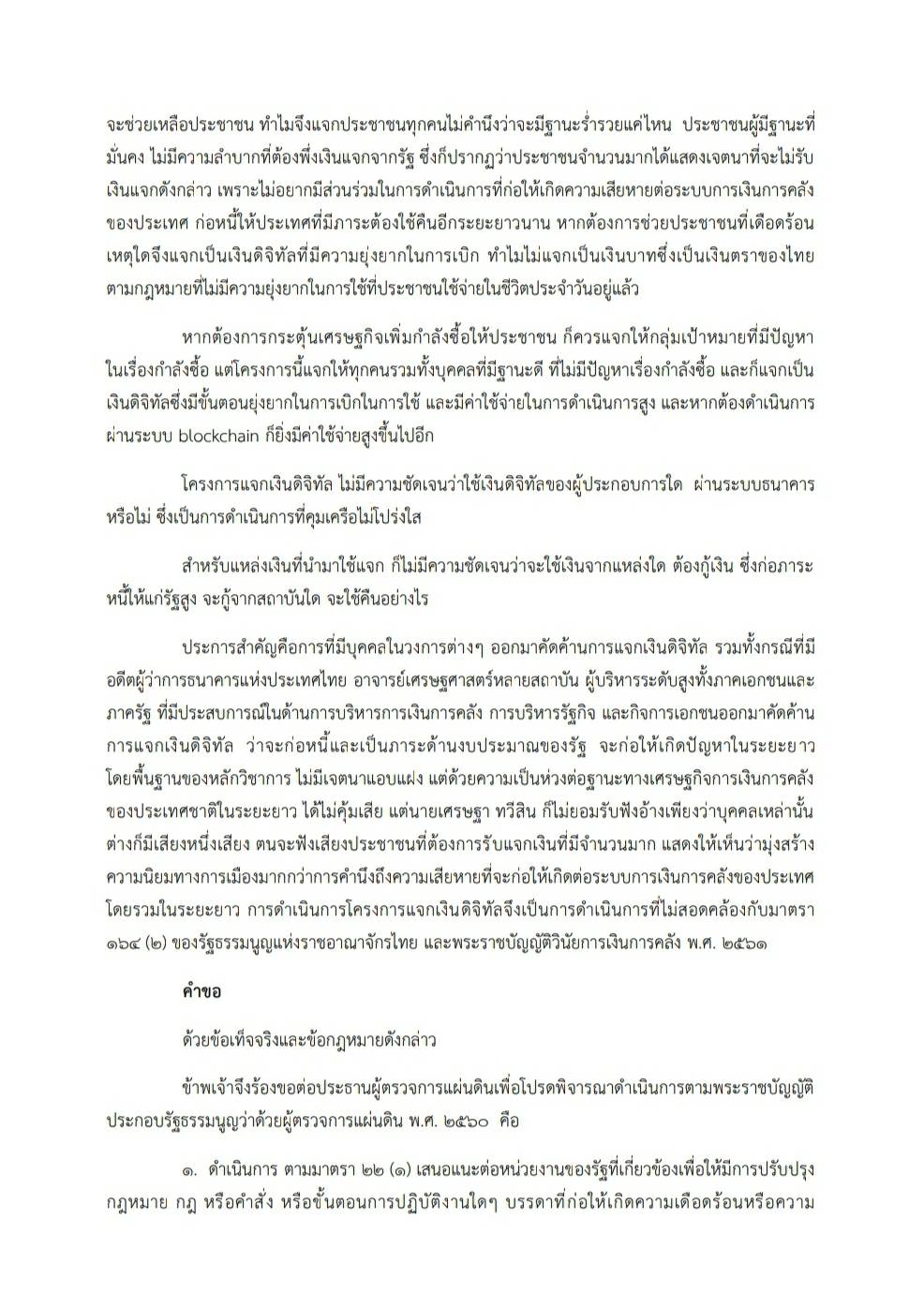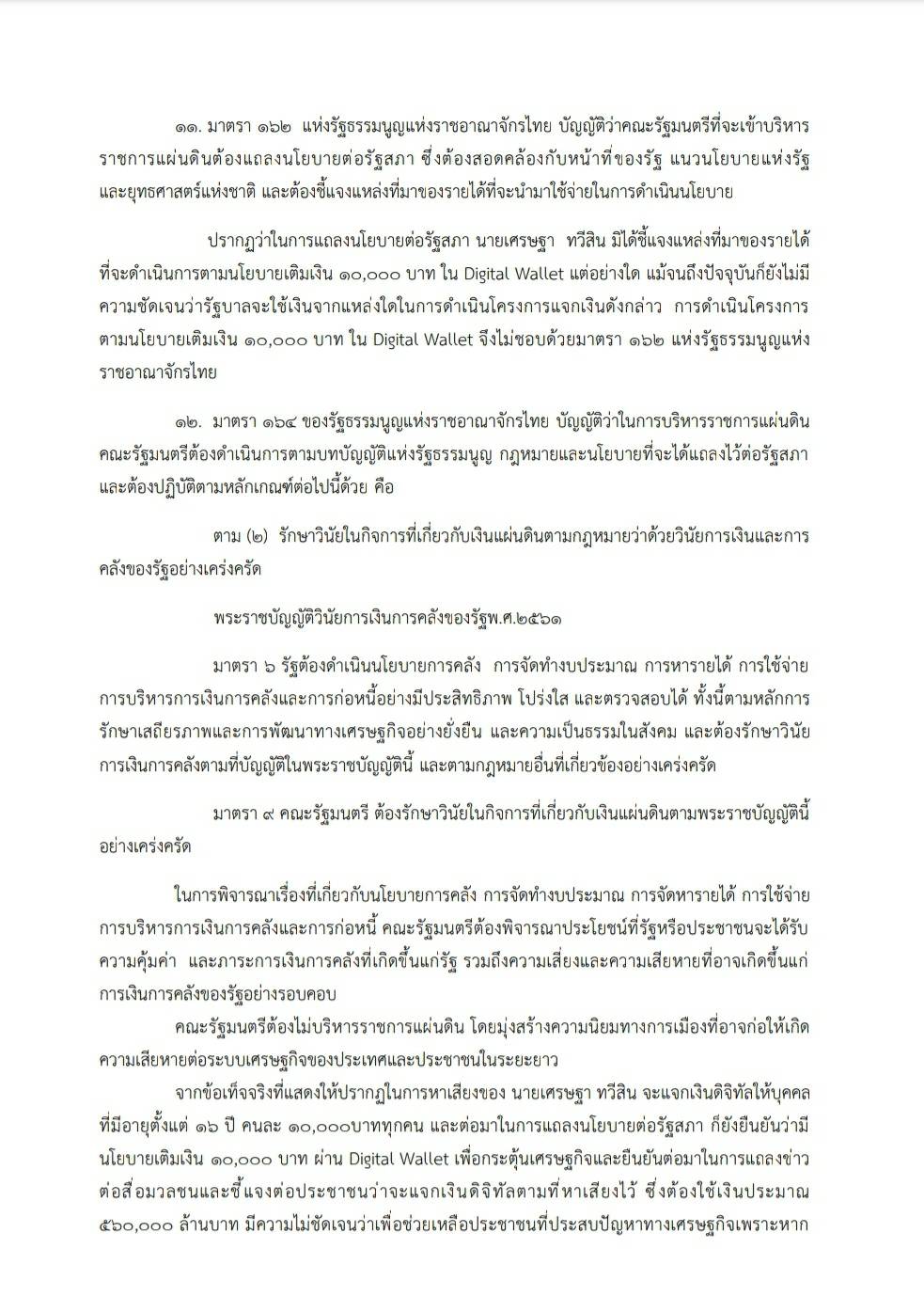 2.ดำเนินการตามมาตรา 23 (2) เสนอเรื่องต่อศาลปกครองให้พิจารณาวินิจฉัย และมีคำพิพากษาหรือคำสั่งระงับการดำเนินการแจกเงินดิจิทัล หรือที่เรียกเป็นอย่าอื่น 10,000 บาท แก่บุคคลที่มีอายุ 16 ปีขึ้นไปทุกคน เพื่อระงับยับยั้งมีให้เป็นการก่อหนี้ ก่อความเสียหายสร้างภาระแก่งบประมาณประเทศและระบบการเงินการคลังของประเทศในระยาวต่อไป