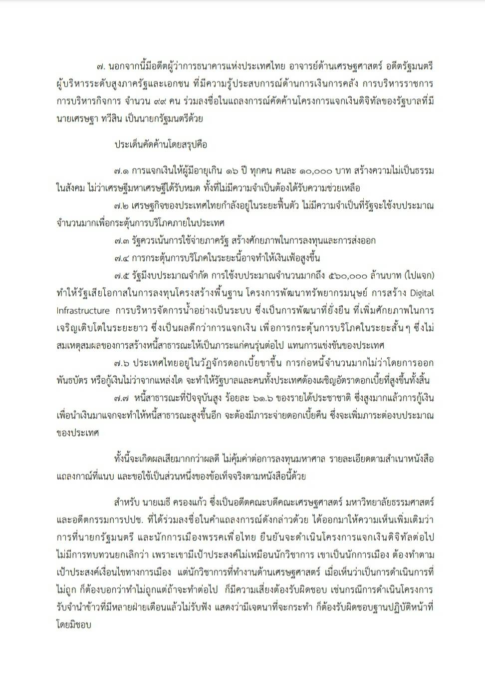 4.การกระตุ้นการบริโภคในระยะนี้อาจทำให้เงินเฟ้อสูงขึ้น 5.รัฐมีงบประมาณจำกัด การใช้งบประมาณจำนวนมากถึง 560,000 ล้านบาท (ไปแจก) ทำให้รัฐเสียโอกาสในการลงทุนโครงสร้างพื้นฐาน โครงการพัฒนาทรัพยากรมนุษย์ การสร้าง Digital Infrastructure การบริหารจัดการน้ำอย่างเป็นระบบ ซึ่งเป็นการพัฒนาที่ยั่งยืน ที่เพิ่มศักยภาพในการเจริญเติบโตในระยะยาว ซึ่งเป็นผลดีกว่าการแจกเงิน เพื่อการกระตุ้นการบริโภคในระยะสั้นๆ ซึ่งไม่สมเหตุสมผลของการสร้างหนี้สาธารณะให้เป็นภาระแก่คนรุ่นต่อไป แทนการแข่งขันของประเทศ