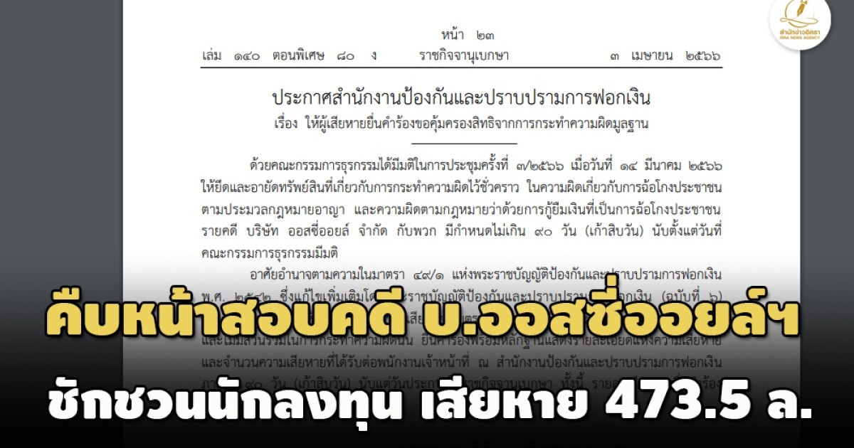 6. คณะกรรมการธุรกรรม สำนักงาน ป.ป.ง. ได้มีมติในการประชุมครั้งที่ 3/2566 เมื่อวันที่ 14 มีนาคม 2566 ให้ยึดและอายัดทรัพย์สินที่เกี่ยวกับการกระทำความผิดไว้ชั่วคราว ในความผิดเกี่ยวกับการฉ้อโกงประชาชน ตามประมวลกฎหมายอาญา และความผิดตามกฎหมายว่าด้วยการกู้ยืมเงินที่เป็นการฉ้อโกงประชาชน รายคดี บริษัท ออสซี่ออยล์ จำกัด กับพวก มีกำหนดไม่เกิน 90 วัน (เก้าสิบวัน) นับตั้งแต่วันที่คณะกรรมการธุรกรรมมีมติ