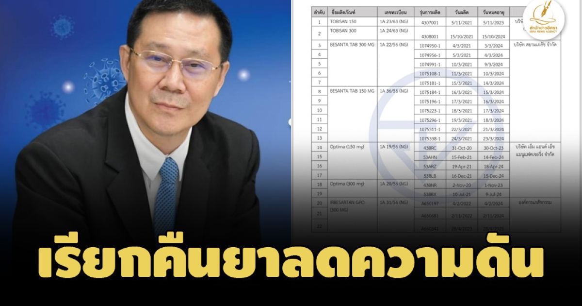 สำนักข่าวอิศรา (www.isranews.org) รายงานว่า เมื่อวันที่ 20 ตุลาคม 2566 นพ.ณรงค์ อภิกุลวณิช รักษาราชการแทนเลขาธิการคณะกรรมการอาหารและยา เปิดเผยว่า กรณีที่ต่างประเทศมีการเรียกคืนยารักษาโรคความดันโลหิตสูงเออบีซาแทน (Irbesartan) จากบริษัทผู้ผลิต เนื่องจากพบการปนเปื้อนสารที่อาจก่อมะเร็งเอแซดบีทีในวัตถุดิบที่ใช้ผลิตยา สำนักงานคณะกรรมการอาหารและยา (อย.) จึงเร่งให้ผู้ผลิตตรวจสอบและเปลี่ยนไปใช้วัตถุดิบที่ไม่มีการปนเปื้อน ควบคู่ไปกับการตรวจสอบเฝ้าระวังผลิตภัณฑ์ยาที่จำหน่ายในท้องตลาด