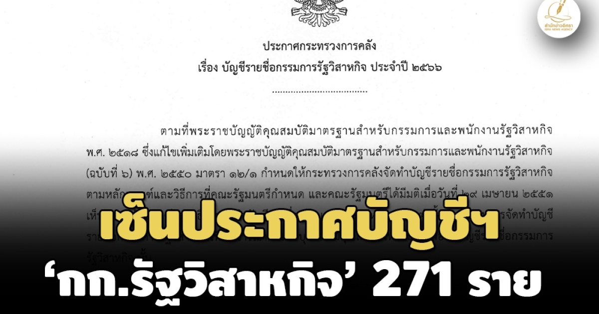 สำนักข่าวอิศรา (www.isranews.org) รายงานว่า เมื่อเร็วๆนี้ นายเศรษฐา ทวีสิน นายกรัฐมนตรี และ รมว.คลัง ลงนามประกาศกระทรวงการคลัง เรื่อง บัญชีรายชื่อกรรมการรัฐวิสาหกิจ ประจำปี 2566 ประกาศ ณ 16 ต.ค.2566 โดยบุคคลในบัญชีรายชื่อกรรมการรัฐวิสาหกิจฉบับดังกล่าว มีจำนวน 271 คน และมีกำหนดพ้นจากบัญชีรายชื่อกรรมการรัฐวิสาหกิจ 5 ปี นับแต่วันที่ประกาศเป็นต้นไป