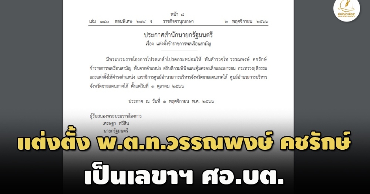 ราชกิจจานุเบกษาเผยแพร่ประกาศแต่งตั้ง พ.ต.ท.วรรณพงษ์ คชรักษ์ พ้นจากอธิบดีกรมพินิจและคุ้มครองเด็ก ไปดำรงตำแหน่งเลขา ศอ.บต. มีผล 1 ต.ค.66
