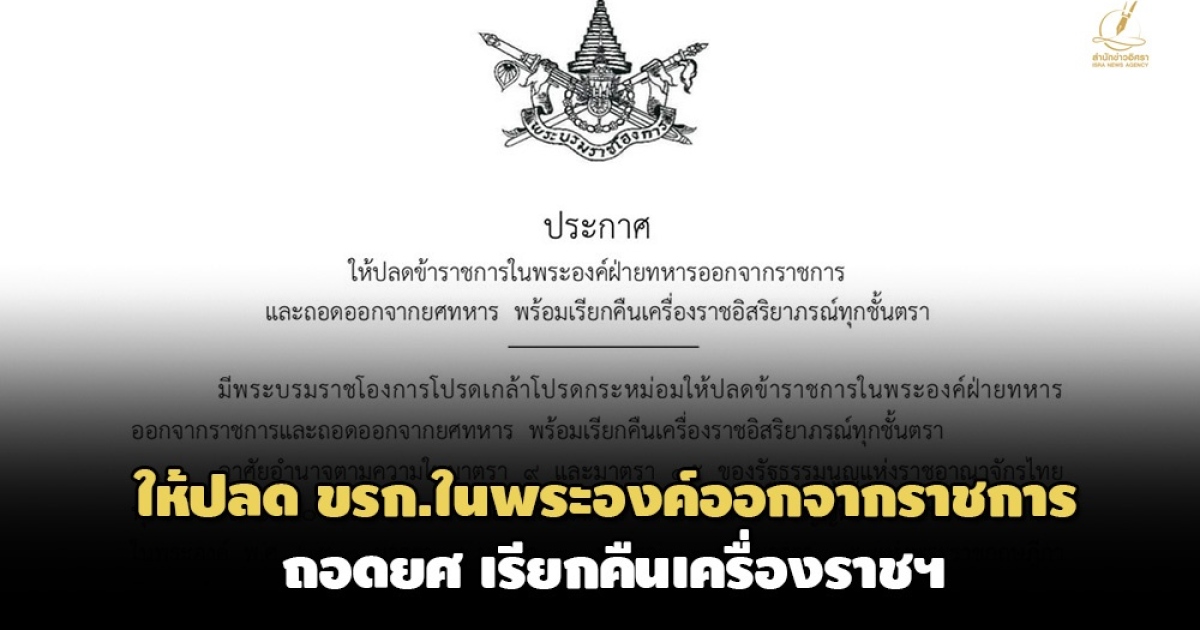 สำนักข่าวอิศรา (www.isranews.org) รายงานว่า เมื่อวันที่ 13 พ.ย. 2566 ราชกิจจานุเบกษา เผยแพร่ประกาศให้ปลดข้าราชการในพระองค์ฝ่ายทหารออกจากราชการ และถอดออกจากยศทหาร พร้อมเรียกคืนเครื่องราชอิสริยาภรณ์ทุกชั้นตรา
