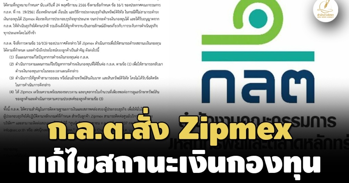 ก.ล.ต. จึงสั่งการตามข้อ 16/1(3) ของประกาศดังกล่าว ให้ Zipmex ดำเนินการเพื่อให้สามารถดำรงสถานะเงินกองทุนได้ตามที่กำหนด และคำนึงถึงประโยชน์ของลูกค้าเป็นสำคัญ ดังต่อไปนี้