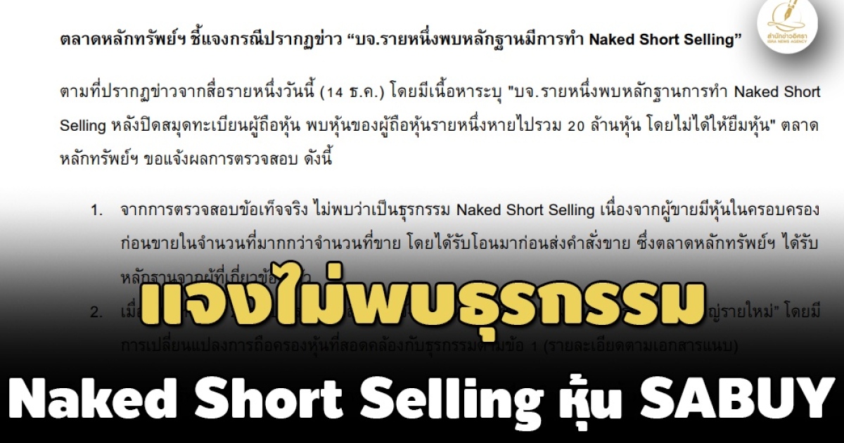 ตลท.แพร่เอกสารชี้แจง ยืนยันไม่พบธุรกรรม Naked Short Selling หุ้น SABUY จำนวน 20 ล้านหุ้น ระบุ ‘ผู้ขาย’ มีหุ้นในครอบครอง ก่อนขายในจำนวนที่ ‘มากกว่า’ จำนวนที่ขาย