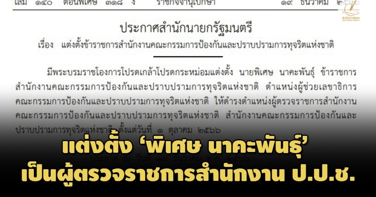 ราชกิจจาฯเผยแพร่ประกาศ โปรดเกล้าฯ แต่งตั้ง 'พิเศษ นาคะพันธุ์' ดำรงตำแหน่ง ผู้ตรวจราชการสำนักงาน คณะกรรมการป้องกันและปราบปรามการทุจริตแห่งชาติ (ป.ป.ช.)