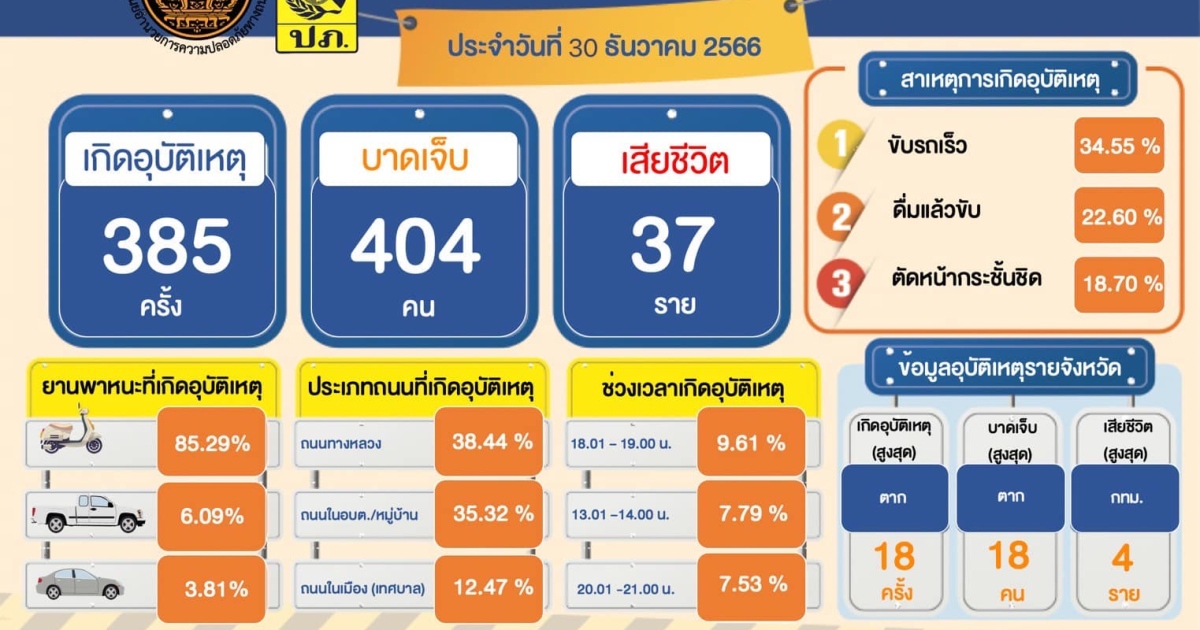 วันที่สอง ช่วง 7 วันอันตรายปีใหม่ 2567 เกิดอุบัติเหตุ 385 ครั้ง บาดเจ็บ 404 ตาย 37 ราย กทม.ดับสูงสุด