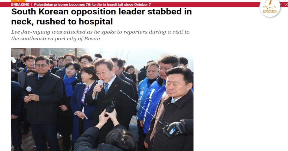 สำนักข่าวอิศรา (www.isranews.org) รายงานว่าเว็บไซต์สำนักข่าวยอนฮับของเกาหลีใต้ รายงานว่า นายอี แจ-มยอง ผู้นำฝ่ายค้านของเกาหลีใต้ถูกคนร้ายแทงคอขณะกำลังตอบคำถามสื่อมวลชนที่เมืองปูซาน ทางตะวันออกเฉียงใต้ของประเทศในวันนี้ (2 ม.ค.) และตอนนี้ถูกส่งตัวไปรักษาที่โรงพยายาลอย่างเร่งด่วนแล้ว