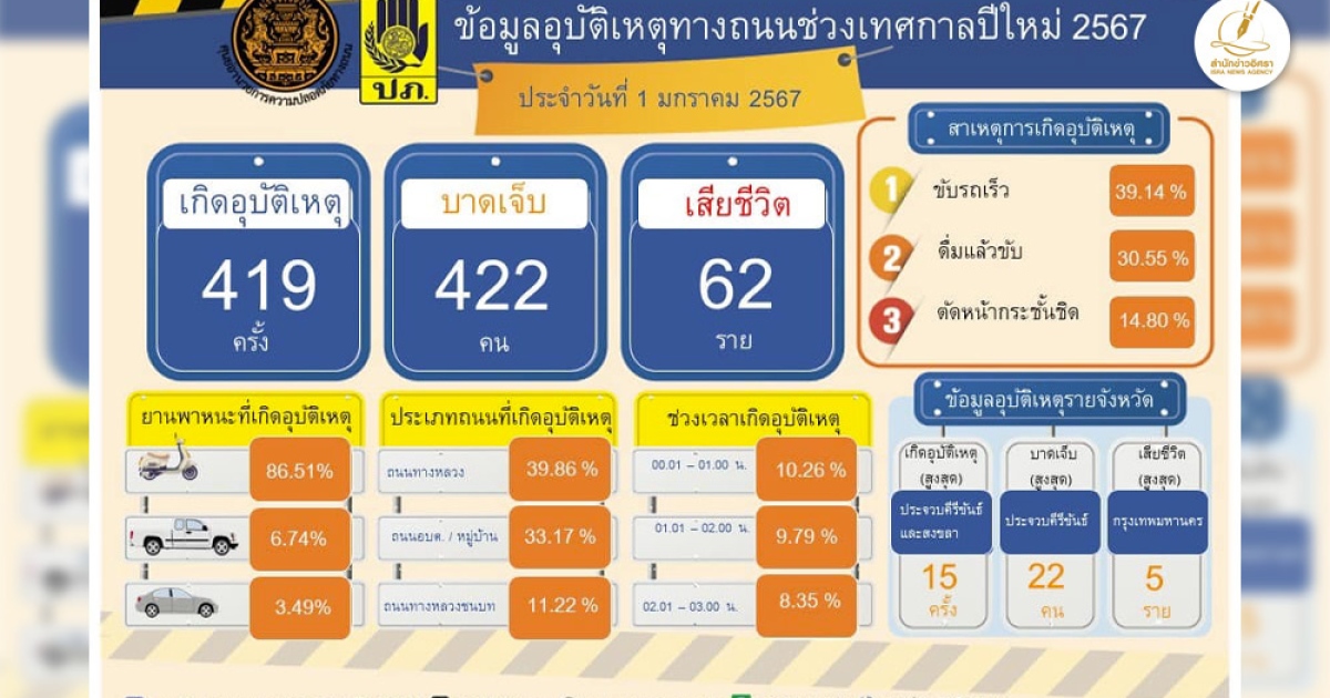สถิติอุบัติเหตุทางถนนช่วงเทศกาลปีใหม่ 2567 วันที่ 1 ม.ค.67 เกิดอุบัติเหตุ 419 ครั้ง ผู้บาดเจ็บ 422 คน ผู้เสียชีวิต 62 ราย สาเหตุหลัก ขับรถเร็ว 39.14%