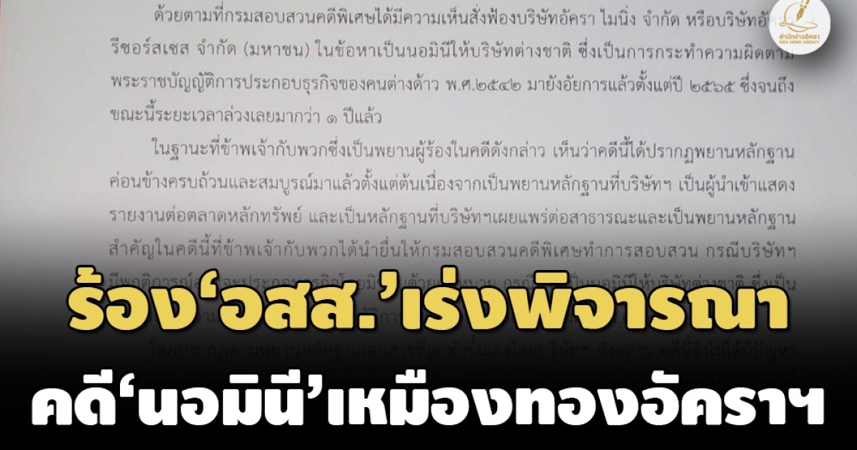 “ด้วยตามที่กรมสอบสวนคดีพิเศษได้มีความเห็นสั่งฟ้องบริษัทอัครา ไมนิ่ง จำกัด หรือบริษัท อัครา รีซอร์สเซส จำกัด (มหาชน) ในข้อหาเป็นนอมินีให้บริษัทต่างชาติ ซึ่งเป็นการกระทำความผิดตามพระราชบัญญัติการประกอบธุรกิจของคนต่างด้าว พ.ศ.2542 มายังอัยการแล้วตั้งแต่ปี 2565 ซึ่งจนถึงขณะนี้ระยะเวลาล่วงเลยมากว่า 1 ปีแล้ว