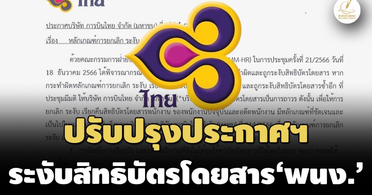 สำนักข่าวอิศรา (www.isranews.org) เมื่อเร็วๆนี้ นายชาย เอี่ยมศิริ ประธานเจ้าหน้าที่บริหาร บมจ.การบินไทย ได้ลงนามในประกาศบริษัท การบินไทย จำกัด (มหาชน) ที่ 001/2567 เรื่อง หลักเกณฑ์การยกเลิก ระงับ เรียกคืนสิทธิบัตรโดยสารพนักงาน ประกาศ ณ วันที่ 12 ม.ค.2567 โดยมีเนื้อหาว่า