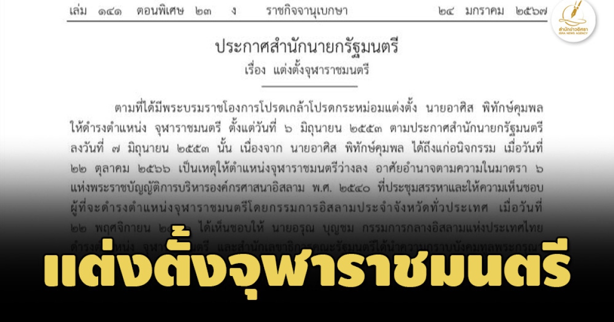 สำนักข่าวอิศรา (www.isranews.org) รายงานว่า เมื่อวันที่ 24 มกราคม 2567 ราชกิจจานุเบกษา แพร่ประกาศสำนักนายกรัฐมนตรี เรื่อง แต่งตั้งจุฬาราชมนตรี