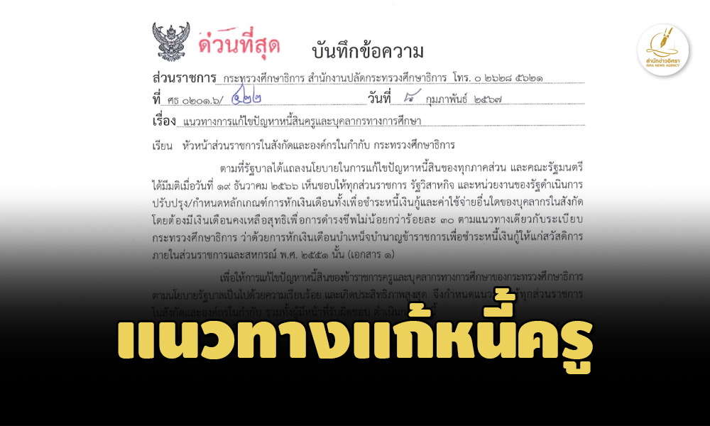 รมว.ศธ. ออกหนังสือกำหนดแนวทางทางการแก้ไขปัญหาหนี้สินครูถึงทุกส่วนราชการในสังกัด ย้ำต้องมีเงินเดือนคงเหลือดำรงชีพไม่น้อยกว่าร้อยละ 30