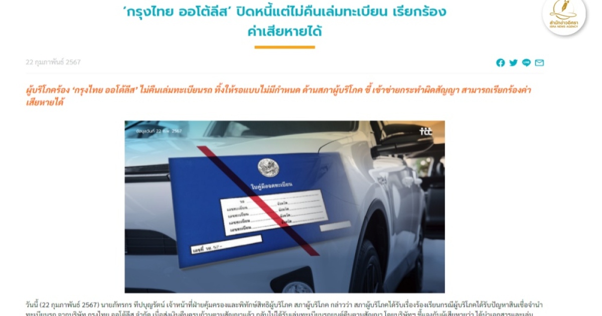 สภาผู้บริโภครับเรื่อง-เตรียมฟ้องศาลเหตุ บ.กรุงไทย ออโต้ลีสไม่ยอมคืนเล่มทะเบียนรถผู้บริโภค แม้ส่งเงินคืนครบถ้วนตามสัญญาสินเชื่อแล้ว เผยทนายบริษัทบอกถ้าอยากได้เล่มคืนต้องไปฟ้องศาล พบความเสียหายกว่า 5.7 ล.