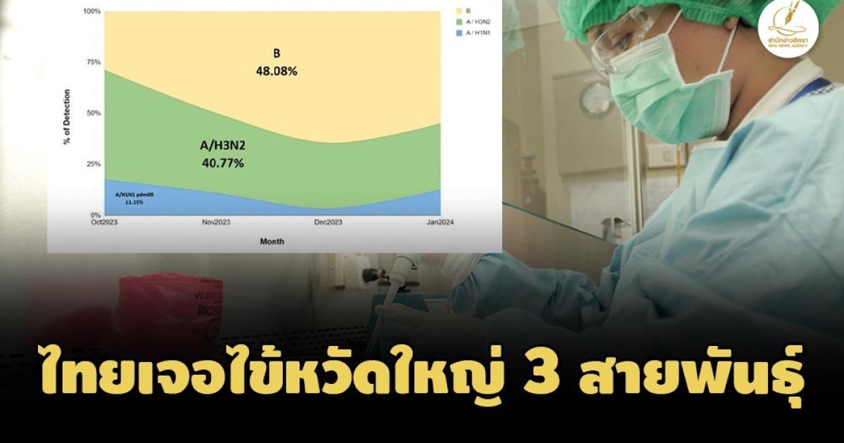 กรมวิทย์ฯเผยผลการเฝ้าระวังสายพันธุ์ของเชื้อไข้หวัดใหญ่ พบสายพันธุ์ B มากสุด 48% รองลงมาชนิด A (H3N2) 40% ส่วน H1N1 pdm09 เจอ11% ย้ำวัคซีนที่ฉีดยังป้องกันได้ ไม่พบยีนที่บ่งชี้การดื้อยา