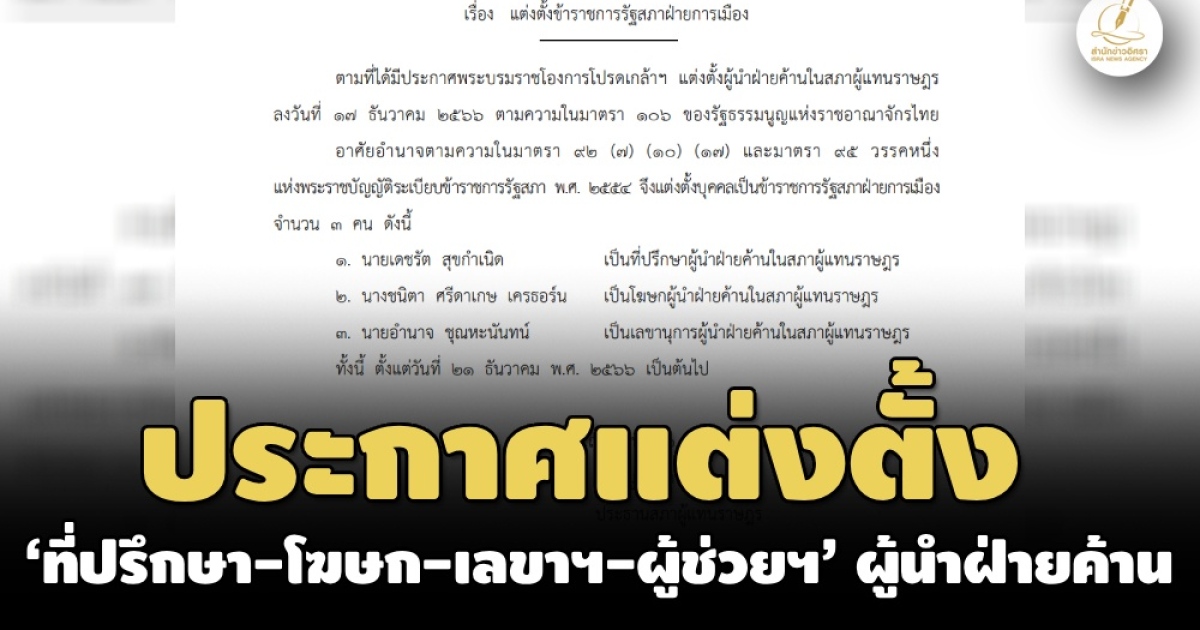 ราชกิจจาฯเผยแพร่ประกาศแต่งตั้งขรก.รัฐสภาฝ่ายการเมือง ‘เดชรัต สุขกำเนิด’ ที่ปรึกษาผู้นำฝ่ายค้าน - ‘ชนิตา ศรีดาเกษ เครธอร์น’ โฆษก - ‘อำนาจ ชุณหะนันทน์’ เลขาฯ - ‘กิตติชัย เตชะกุลวณิชย์’ ผู้ช่วยฯ