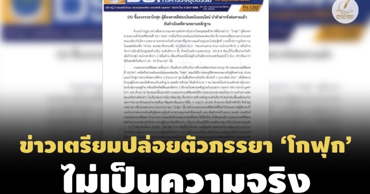 สำนักข่าวอิศรา (www.isranews.org) รายงานว่า เมื่อวันที่ 11 มี.ค. 2567 กรมสอบสวนคดีพิเศษ (DSI) เผยแพร่ข่าวประชาสัมพันธ์ชี้แจงประเด็นข่าวเตรียมปล่อยตัวภรรยา 'โกฟุก' ผู้ต้องหาคดีพนันออนไลน์และฟอกเงินว่า ไม่เป็นความจริง ทำให้กรมสอบสวนคดีพิเศษรวมถึงกระบวนการยุติธรรมชั้นศาลเสียหาย และจะได้สืบสวนหาต้นตอข้อมูลแหล่งข่าวและวัตถุประสงค์ที่ดำเนินการต่อไป โดยเมื่อวันที่ 9 มี.ค. 2567 ศาลอาญาได้วินิจฉัยคำร้องขอปล่อยตัวชั่วคราวและคำคัดค้านของพนักงานสอบสวนคดีพิเศษแล้ว มีคำสั่งยกคำร้องการขอปล่อยตัวชั่วคราว