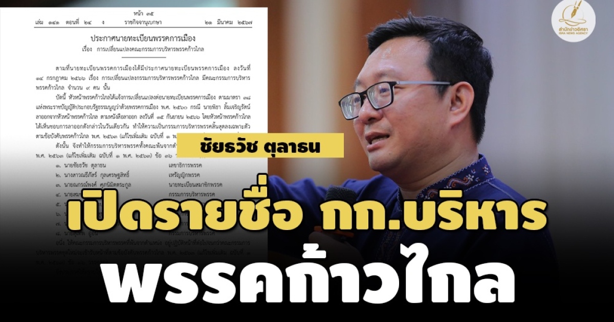 ราชกิจจานุเบกษา เผยแพร่ ประกาศนายทะเบียนพรรคการเมืองเรื่อง การเปลี่ยนแปลงคณะกรรมการบริหารพรรคก้าวไกล ก่อนเผย 8 รายชื่อกรรมการบริหารพรรค ‘ชัยธวัช’ รั้งตำแหน่งหัวหน้า