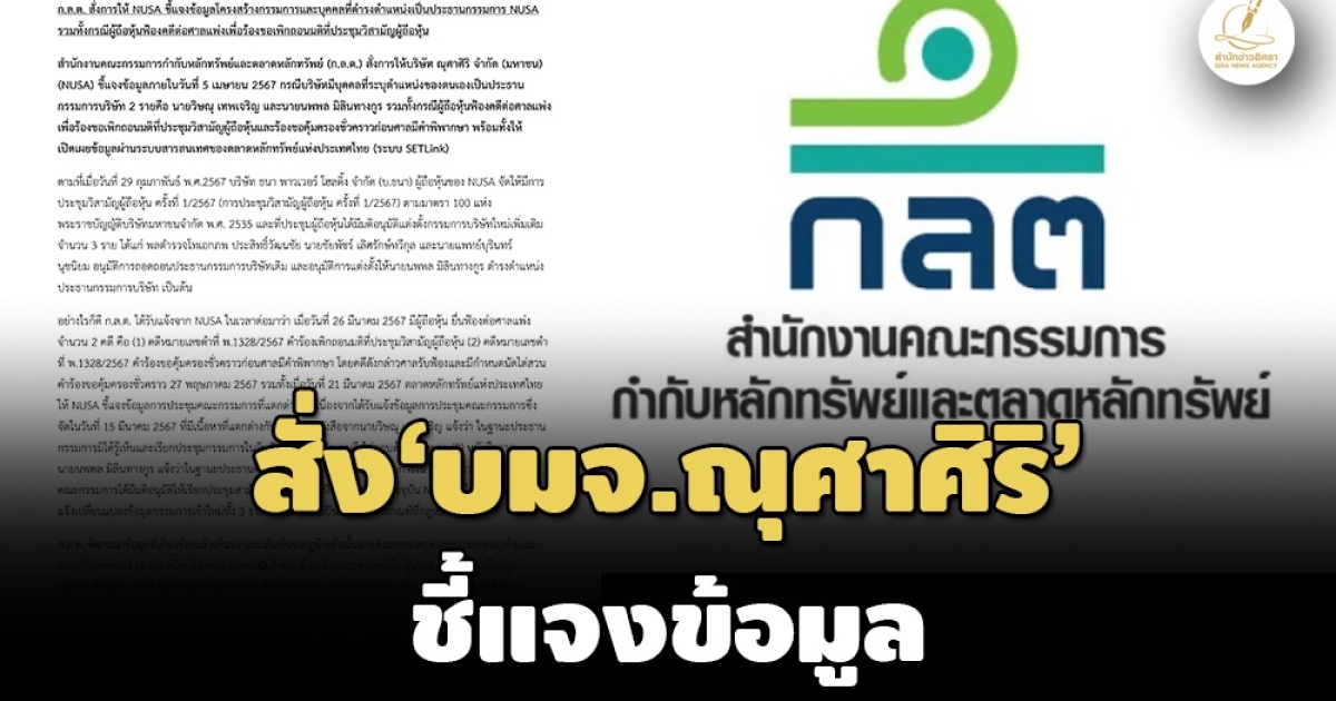 เมื่อวันที่ 29 มี.ค. สำนักงานคณะกรรมการกำกับหลักทรัพย์และตลาดหลักทรัพย์ (ก.ล.ต.) สั่งการให้บริษัท ณุศาศิริ จำกัด (มหาชน) (NUSA) ชี้แจงข้อมูลภายในวันที่ 5 เมษายน 2567 กรณีบริษัทมีบุคคลที่ระบุตำแหน่งของตนเองเป็นประธานกรรมการบริษัท 2 ราย คือ นายวิษณุ เทพเจริญ และนายนพพล มิลินทางกูร รวมทั้งกรณีผู้ถือหุ้นฟ้องคดีต่อศาลแพ่งเพื่อร้องขอเพิกถอนมติที่ประชุมวิสามัญผู้ถือหุ้น และร้องขอคุ้มครองชั่วคราวก่อนศาลมีคำพิพากษา พร้อมทั้งให้เปิดเผยข้อมูลผ่านระบบสารสนเทศของตลาดหลักทรัพย์แห่งประเทศไทย (ระบบ SETLink)