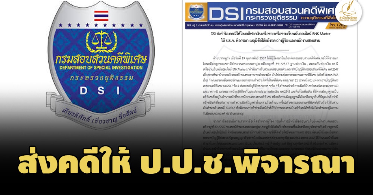 ดีเอสไอ ส่งคำร้องกรณีให้โอนคดีฟอกเงินเครือข่ายเว็บพนัน BNK Master ให้ ป.ป.ช. พิจารณา เหตุมีข้อโต้แย้งระหว่างผู้ร้อง-พนักงานสอบสวน ชี้หากไม่อยู่ในอำนาจ พร้อมดำเนินการตาม พ.ร.บ.การสอบสวนคดีพิเศษ 2547
