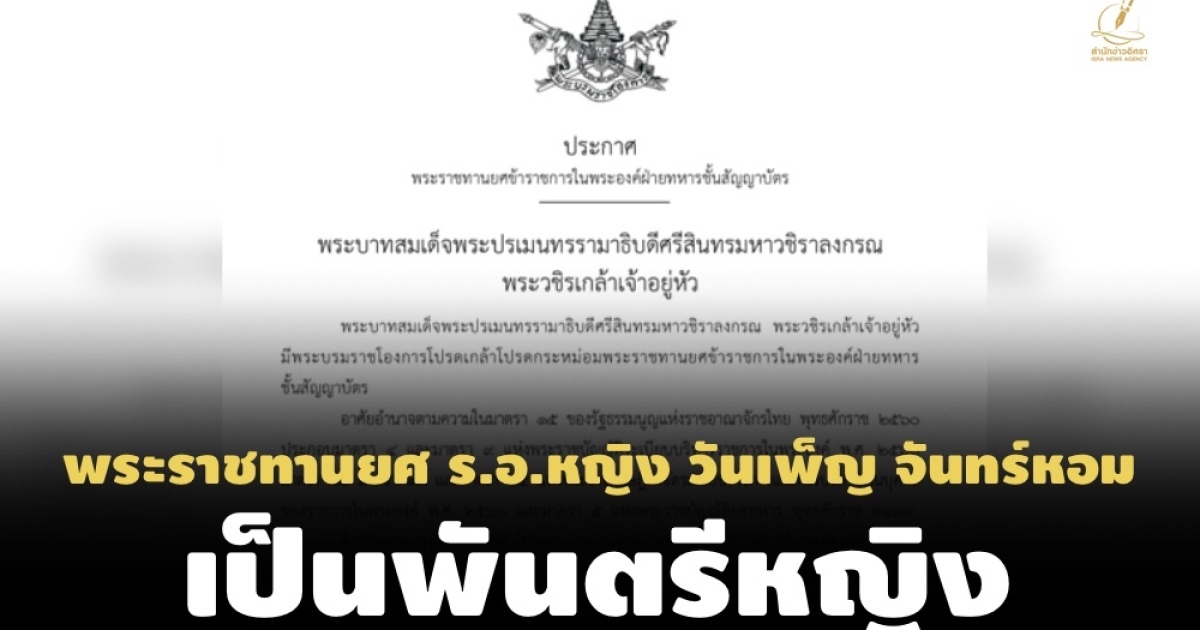 ราชกิจจานุเบกษา เผยแพร่ประกาศ โปรดเกล้าฯพระราชทานยศข้าราชการในพระองค์ฝ่ายทหารชั้นสัญญาบัตร ร้อยเอกหญิง วันเพ็ญ จันทร์หอม เป็นพันตรีหญิง