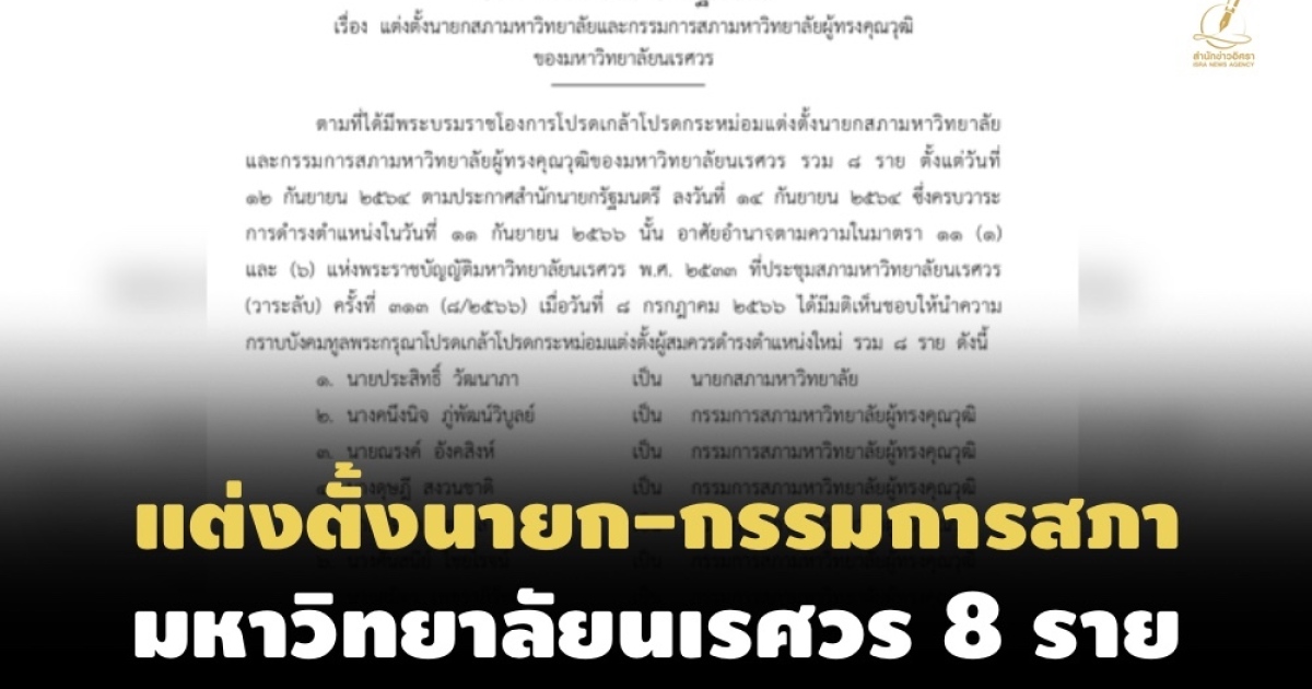 สำนักข่าวอิศรา (www.isranews.org) รายงานว่า วันที่ 2 เม.ย. 2567 ราชกิจจานุเบกษาแพร่ประกาศสำนักนายกรัฐมนตรี เรื่อง แต่งตั้ง นายกสภามหาวิทยาลัยและกรรมการสภามหาวิทยาลัยผู้ทรงคุณวุฒิของ มหาวิทยาลัยนเรศวร 8 ราย