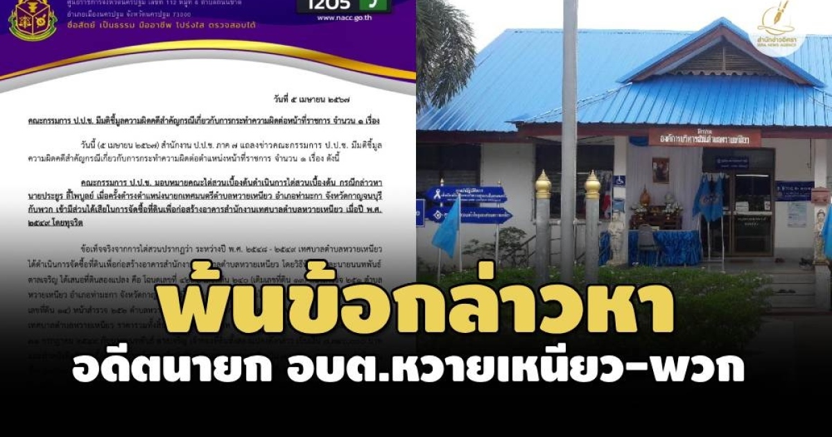 ซึ่งผู้ถูกกล่าวหาที่ 1 ได้จัดซื้อไว้ก่อนหน้าดำเนินโครงการดังกล่าว (เมื่อวันที่ 7 ธันวาคม 2548 และวันที่ 10 มกราคม 2549 ตามลำดับ) เพื่อนำไปใช้เป็นที่ดินข้างเคียงเปรียบเทียบกับราคาที่ดินทั้งสองแปลงที่เทศบาลตำบลหวายเหนียวจะดำเนินการจัดซื้อ โดยมีข้อพิรุธและพฤติการณ์เชื่อได้ว่า นายเฉลียว ชินหอม ผู้ถูกกล่าวหาที่ 3 นายสมศักดิ์ ธนทวีธรรม ผู้ถูกกล่าวหาที่ 5 นายนนทพันธ์ ตาลเจริญ ผู้ถูกกล่าวหาที่ 6 ได้ร่วมกันอำพรางการโอนกรรมสิทธิ์ในที่ดินดังกล่าวเพื่อหลีกเลี่ยงการเป็นผู้มีส่วนได้เสีย และขายที่ดินให้แก่เทศบาลตำบลหวายเหนียวเพื่อก่อสร้างอาคารสำนักงานเทศบาลตำบลหวายเหนียว โดยใช้บัญชีเงินฝากของนางบุญยืน ชินหอม ผู้ถูกกล่าวหาที่ 4 รับเงินค่าจัดซื้อที่ดินทั้งสองแปลงดังกล่าว