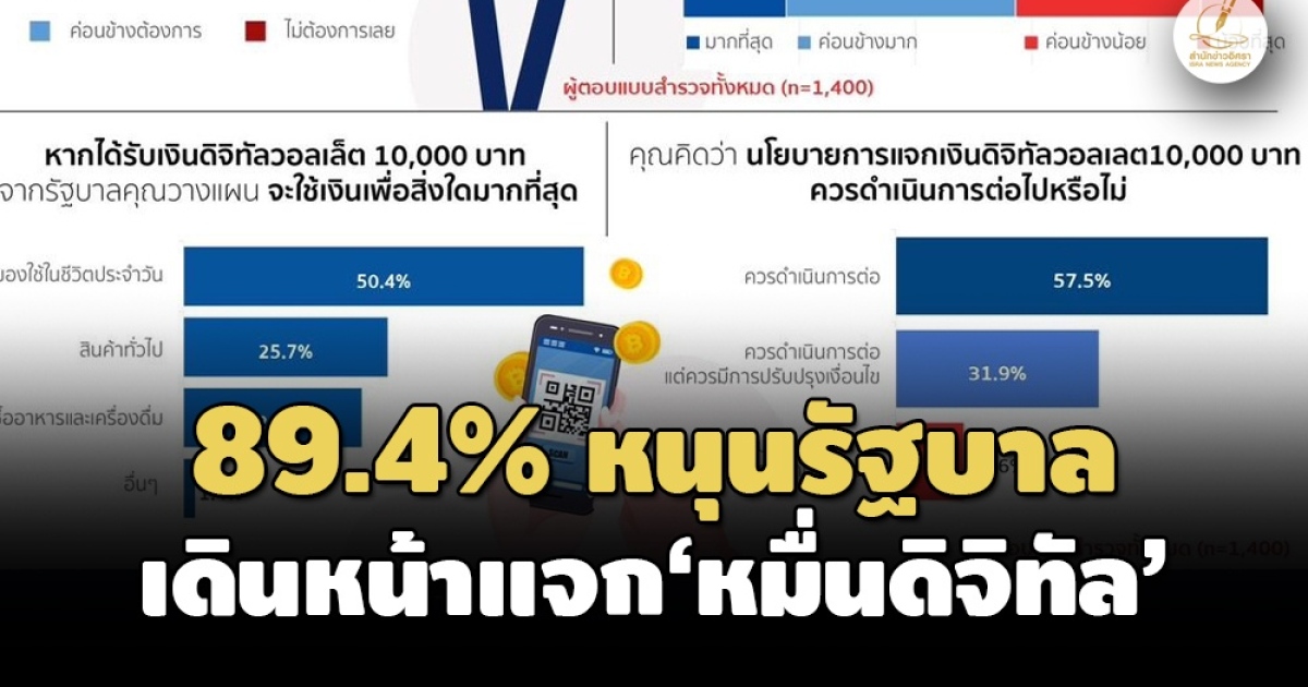 สำนักวิจัยมหาวิทยาลัย ‘นอร์ทกรุงเทพ’ เผยผลสำรวจฯ พบว่าประชาชน 89.4% หนุนรัฐบาลเดินหน้าแจกเงินดิจิทัล 1 หมื่นบาท มีเพียง 10.6% ที่ระบุว่า ควรหยุดนโยบายนี้