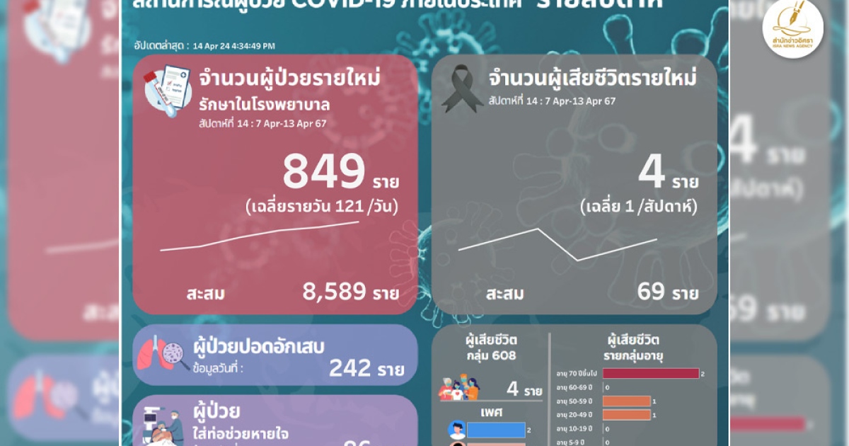 สถานการณ์โควิดไทย สัปดาห์ล่าสุด 7 – 13 เมษายน 2567 ติดเชื้อเข้ารักษาใน รพ.ใหม่ 849 ราย เฉลี่ย 121/วัน เสียชีวิต 2 ราย อาการหนัก 242 ราย