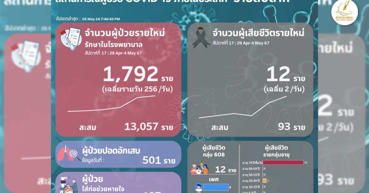 สถานการณ์โควิดไทย สัปดาห์ล่าสุด 28 เม.ย. - 4 พ.ค. 2567 ติดเชื้อเข้ารักษาใน รพ.ใหม่ 1,792 ราย เฉลี่ย 256/วัน เสียชีวิต 12 ราย อาการหนัก 501 ราย