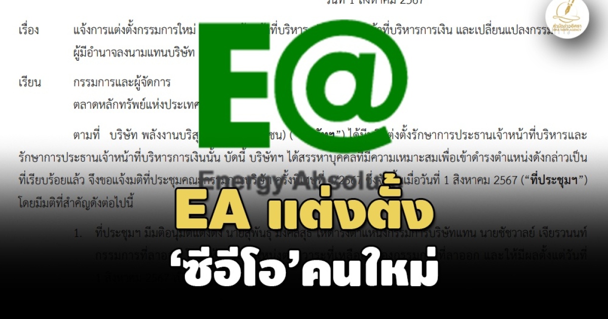 สำนักข่าวอิศรา (www.isranews.org) รายงานว่า เมื่อวันที่ 1 ส.ค.ที่ผ่านมา บมจ.พลังงานบริสุทธิ์ (EA) แจ้งตลาดหลักทรัพย์ฯ ว่า ตามที่ บมจ.พลังงานบริสุทธิ์ ได้มีมติแต่งตั้งรักษาการประธานเจ้าหน้าที่บริหารและรักษาการประธานเจ้าหน้าที่บริหารการเงิน นั้น บัดนี้ บริษัทฯ ได้สรรหาบุคคลที่มีความเหมาะสมเพื่อเข้าดำรงตำแหน่งดังกล่าวเป็นที่เรียบร้อยแล้ว จึงขอแจ้งมติที่ประชุมคณะกรรมการบริษัท ครั้งพิเศษที่ 4/2567 ซึ่งจัดขึ้นเมื่อวันที่ 1 ส.ค.2567 ดังต่อไปนี้