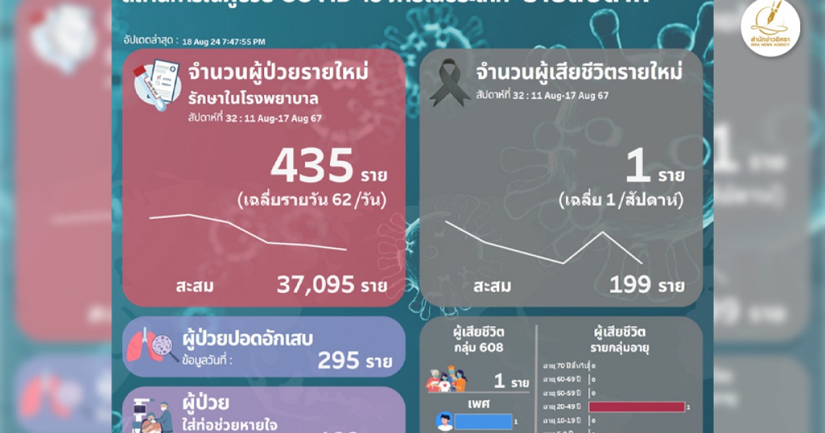 สำนักข่าวอิศรา (www.isranews.org) รายงานสถานการณ์แพร่ระบาดของโรคโควิด-19 ประเทศไทย ประจำสัปดาห์ ระหว่างวันที่ 11 – 17 สิงหาคม 2567 มีผู้ติดเชื้อรายใหม่ รักษาในโรงพยาบาล (รายสัปดาห์) 435 ราย เฉลี่ยวันละ 62 ราย สะสม 37,095 ราย