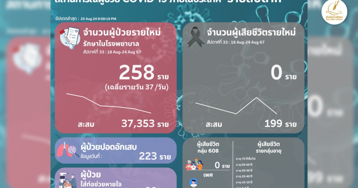 สถานการณ์โควิดไทย สัปดาห์ล่าสุด 18 - 24 ส.ค. 2567 ติดเชื้อเข้ารักษาใน รพ.ใหม่ 258 ราย เฉลี่ย 37/วัน ไม่มีผู้เสียชีวิต อาการหนัก 223 ราย