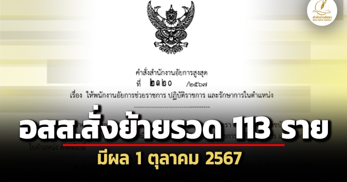 สำนักข่าวอิศรา (www.isranews.org) รายงานว่า เมื่อวันที่ 11 กันยายน 2567 นายอำนาจ เจตน์เจริญรักษ์ อัยการสูงสุด (อสส.) ลงนามในคำสั่งสำนักงานอัยการสูงสุด ที่ 2120/2565 เรื่อง ให้พนักงานอัยการช่วยราชการและรักษาการในตำแหน่ง จำนวน 113 ราย อาศัยอำนาจตามความในมาตรา 13 มาตรา 15 และมาตรา 27 แห่งพระราชบัญญัติองค์กรอัยการและพนักงานอัยการ พ.ศ.2553 จึงมีคำสั่งให้พนักงานอัยการช่วยราชการ ปฏิบัติราชการและรักษาการในตำแหน่ง ดังต่อไปนี้ ทั้งนี้ ตั้งแต่วันที่ 1 ตุลาคม 2567 เป็นต้นไป