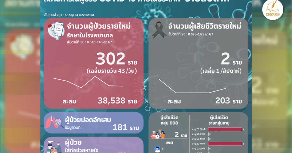 สถานการณ์โควิดไทย สัปดาห์ล่าสุด 8 - 14 กันยายน 2567 ติดเชื้อเข้ารักษาใน รพ.ใหม่ 302 ราย เฉลี่ย 43/วัน เสียชีวิต 2 ราย อาการหนัก 181 ราย
