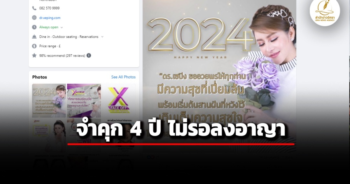 ศาลอาญาพิพากษาจำคุก ‘เซปิง’ กับพวก 4 ปี ไม่รอลงอาญา คดีฉ้อโกงประชาชน เหตุโฆษณาหลอกลวง อ้างธุรกิจเฟซออฟทำศัลยกรรมไร้รอยแผล แต่ปรากฎเหยื่อทำศัลยกรรมแล้วมีแผลเกินร้อยละ 10 ขณะแพทย์ศัลยกรรมโดนโทษ 6 เดือนให้รอลงอาญา