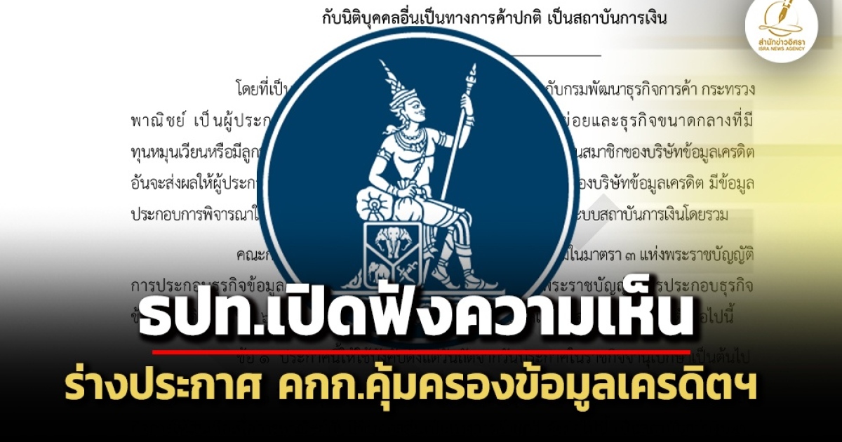 สำนักข่าวอิศรา (www.isranews.org) รายงานว่า เมื่อวันที่ 20 ก.ย.ที่ผ่านมา ธนาคารแห่งประเทศไทย (ธปท.) ได้เปิดรับฟังความคิดเห็นฯ ร่างประกาศคณะกรรมการคุ้มครองข้อมูลเครดิต (กคค.) เรื่อง กำหนดให้นิติบุคคลที่ประกอบกิจการให้สินเชื่อเพื่อการพาณิชย์กับนิติบุคคลอื่นเป็นทางการค้าปกติ เป็นสถาบันการเงิน โดย ธปท.จะเปิดรับฟังความคิดเห็นร่างประกาศ กคค. ฉบับนี้ไปจนถึงวันที่ 7 ต.ค.2567