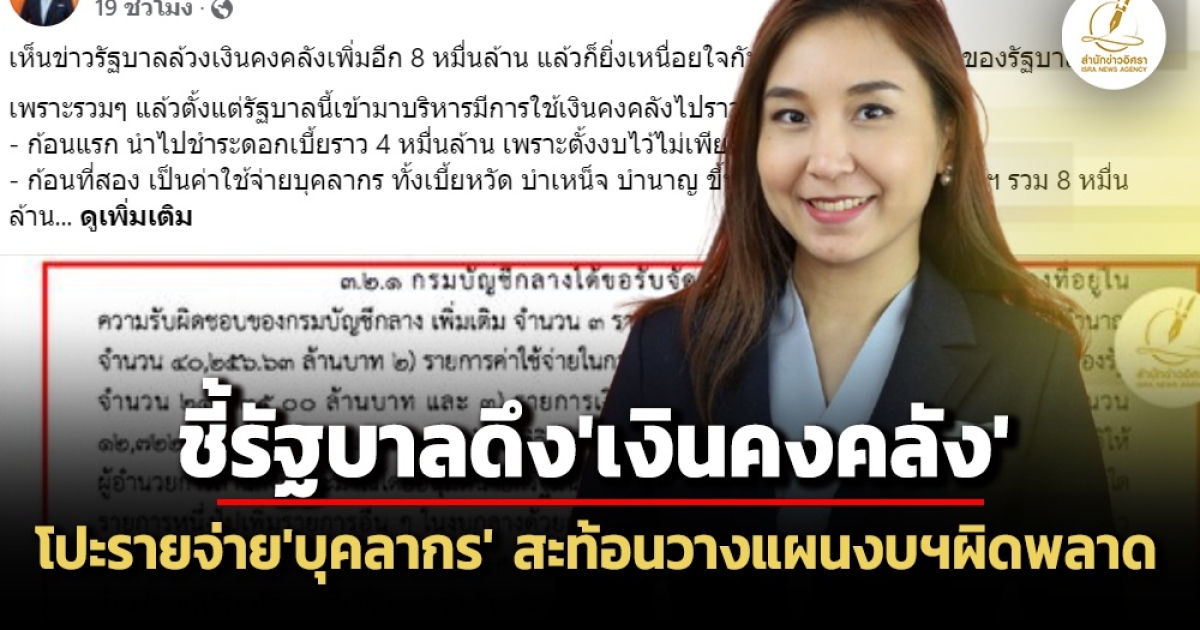 สำนักข่าวอิศรา (www.isranews.org) รายงานว่า ล่าสุด น.ส.ศิริกัญญา ตันสกุล สส.บัญชีรายชื่อ พรรคประชาชน ได้โพสต์ข้อความบนเพจเฟซบุ๊กส่วนตัว ‘Sirikanya Tansakun - ศิริกัญญา ตันสกุล’ โดยระบุว่า การที่รัฐบาลต้องนำเงินคงคลังมาเป็นค่าใช้จ่ายบุคลากร ทั้งเบี้ยหวัด บำเหน็จ บำนาญ ขึ้นเงินเดือนข้าราชการ ฯลฯ รวม 8 หมื่นล้าน สะท้อนถึงการวางแผนงบประมาณที่ผิดพลาด