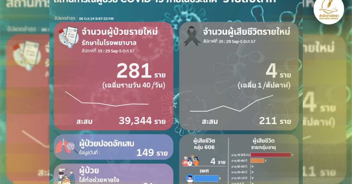 สำนักข่าวอิศรา (www.isranews.org) รายงานสถานการณ์แพร่ระบาดของโรคโควิด-19 ประเทศไทย ประจำสัปดาห์ ระหว่างวันที่ 29 ก.ย. - 5 ต.ค. 2567 มีจำนวนผู้ติดเชื้อใหม่เข้ารักษาตัวโรงพยาบาล 281 ราย เฉลี่ยวันละ 40 ราย ทำให้จำนวนผู้ติดเชื้อสะสมอยู่ที่ 39,344 ราย (ตั้งแต่ 1 ม.ค. 2567)