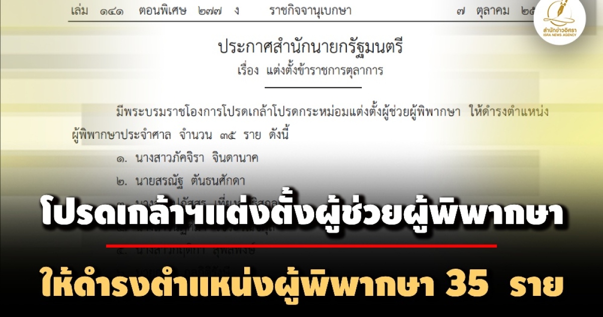 ราชกิจจาฯเผยแพร่ประกาศโปรดเกล้าฯแต่งตั้งผู้ช่วยผู้พิพากษาให้ดำรงตำแหน่งผู้พิพากษาประจำศาล 35 ราย