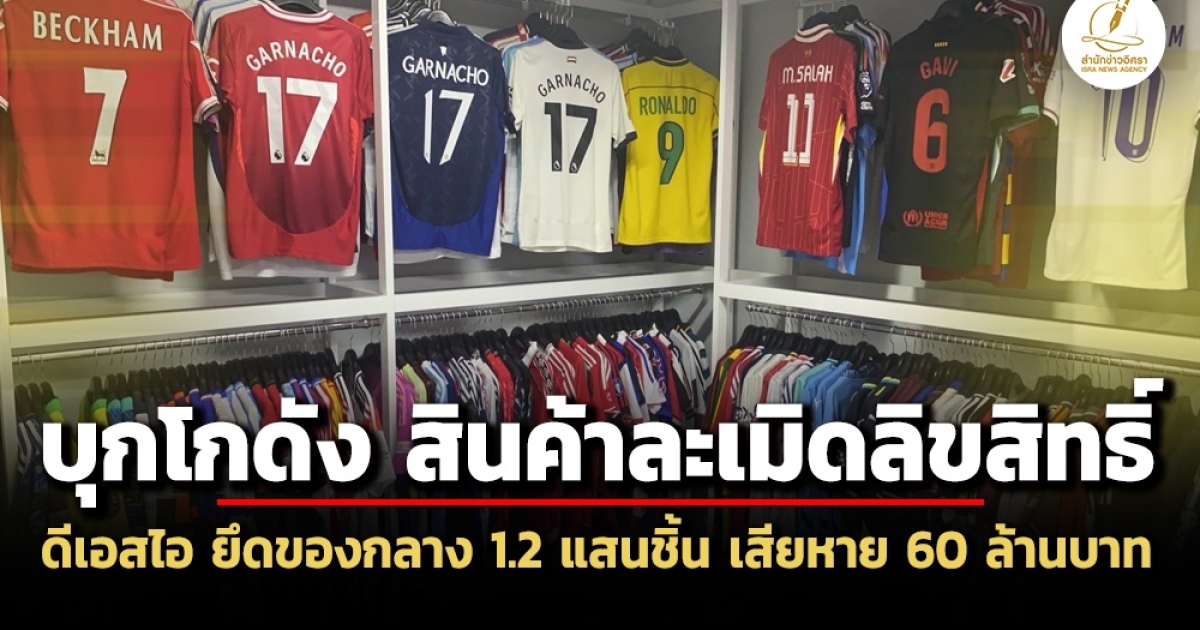 ดีเอสไอ บุกค้นแหล่งจำหน่ายสินค้า-โกดังเก็บสินค้าหลายจุด ยึดสินค้าสินค้าละเมิดลิขสิทธิ์ เสื้อผ้า-ชุดกีฬาของสโมสรฟุตบอลต่างประเทศชื่อดัง กว่า 120,000 ชิ้น มูลค่าความเสียหายกว่า 60 ล้านบาท
