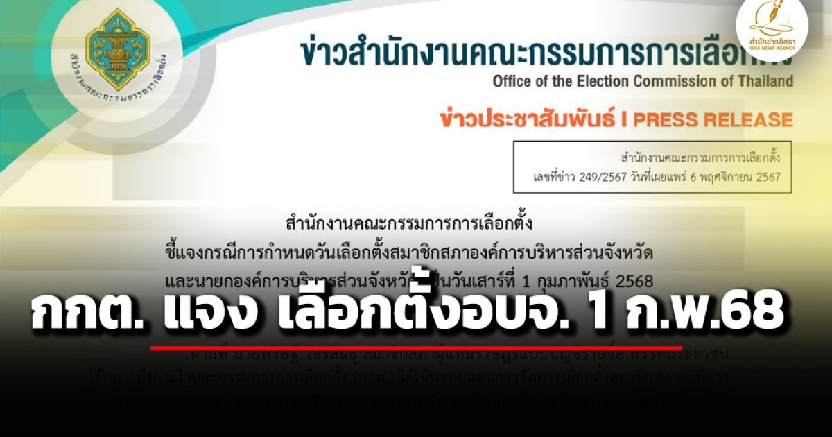 คณะกรรมการการเลือกตั้ง ชี้แจง กำหนดวันเลือกตั้งสมาชิกสภาองค์การบริหารส่วนจังหวัด-นายกองค์การบริหารส่วนจังหวัด ในวันเสาร์ ที่ 1 กุมภาพันธ์ 2568 อ้าง สุ่มเสียงจัดการเลือกตั้งเกิน 45 วัน - ผู้สมัครรับเลือกตั้งมีเวลาหาเสียงน้อย มีเวลาพิจารณาสิทธิ์ผู้สมัครรับเลือกตั้งมากขึ้น