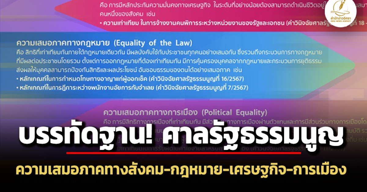 สำนักข่าวอิศรา (www.isranews.org.) รายงานว่า วันที่ 9 พฤศจิกายน 2567 Line Official สำนักงานศาลรัฐธรรมนูญได้เผยแพร่ อินโฟกราฟิกเรื่อง ‘การคุ้มครองความเสมอภาคทางสังคม เศรษฐกิจ กฎหมาย และการเมือง รวมถึงความเสมอภาคในโอกาส ตามรัฐธรรมนูญ แห่งราชอาณาจักรไทย พุทธศักราช 2560 ของศาลรัฐธรรมนูญไทย’ พร้อมกับระบุวัตถุประสงค์ของศาลรัฐธรรมนูญ เพื่อสรุปเนื้อหาเป็นภาพทำให้เข้าใจง่ายในรูปแบบของภาพอินโฟกราฟิก ดังนี้