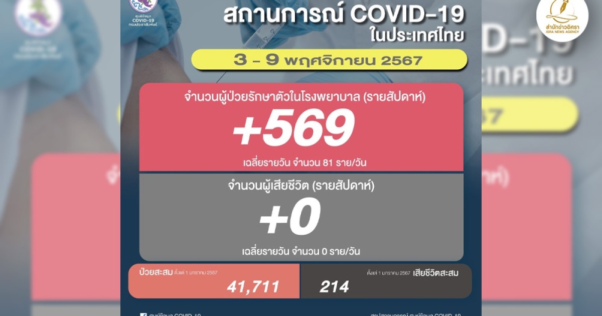สำนักข่าวอิศรา (www.isranews.org) รายงานสถานการณ์แพร่ระบาดของโรคโควิด-19 ประเทศไทย ประจำสัปดาห์ ระหว่างวันที่ 3 - 9 พ.ย. 2567 มีจำนวนผู้ติดเชื้อใหม่เข้ารักษาตัวโรงพยาบาล 569 ราย เฉลี่ยวันละ 81 ราย ทำให้จำนวนผู้ติดเชื้อสะสมอยู่ที่ 41,711 ราย (ตั้งแต่ 1 ม.ค. 2567)