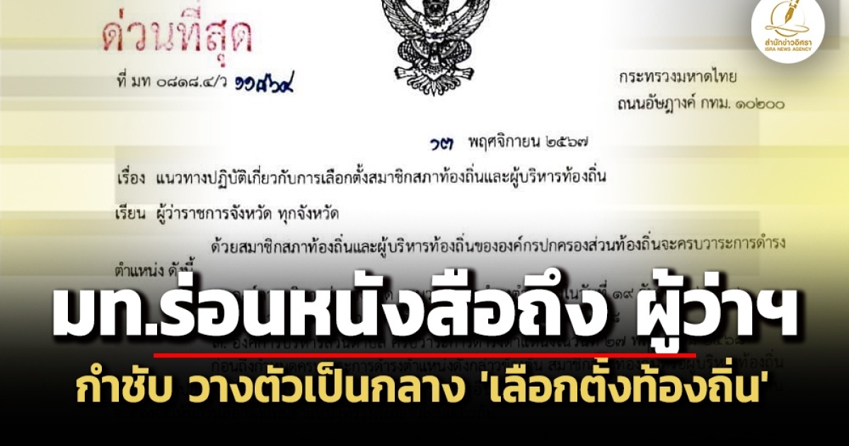 สำนักข่าวอิศรา (www.isranews.org) รายงานว่า เมื่อวันที่ 13 พฤศจิกายน 2567 นายอรรษิษฐ์ สัมพันธรัตน์ ปลัดกระทรวงมหาดไทย ได้ลงนามในหนังสือเวียน ด่วนที่สุด ที่ มท 0818.4/ว 11864 เรื่อง แนวทางปฏิบัติเกี่ยวกับการเลือกตั้งสมาชิกสภาท้องถิ่นและผู้บริหารท้องถิ่น ถึงผู้ว่าราชการจังหวัดทุกจังหวัด เนื่องจากสมาชิกท้องถิ่นและผู้บริหารท้องถิ่นขององค์กรปกครองส่วนท้องถิ่นจะครบวาระการดำรงตำแหน่ง โดยมีข้อความสรุปได้ว่า ขอให้ผู้ว่าราชการจังหวัดทุกจังหวัด และเจ้าหน้าที่สังกัดกระทรวงมหาดไทย รวมถึงกำนัน ผู้ใหญ่บ้าน แพทย์ประจำตำบล สารวัตรกำนัน และผู้ช่วยผู้ใหญ่บ้าน วางตัวเป็นกลางทางการเมืองอย่างเคร่งครัด