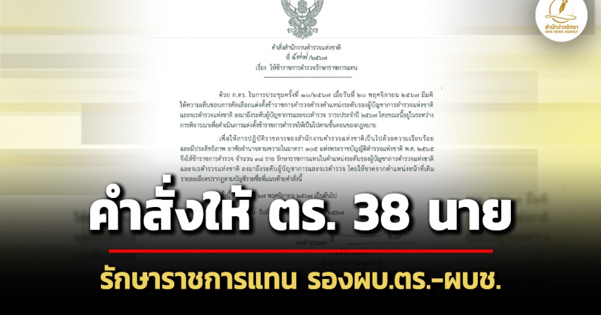 ผบ.ตร.ลงนามคำสั่งให้ข้าราชการตำรวจ 38 ราย รักษาราชการแทนระหว่างพิจารณาแต่งตั้ง รองผบ.ตร.-ผบช.